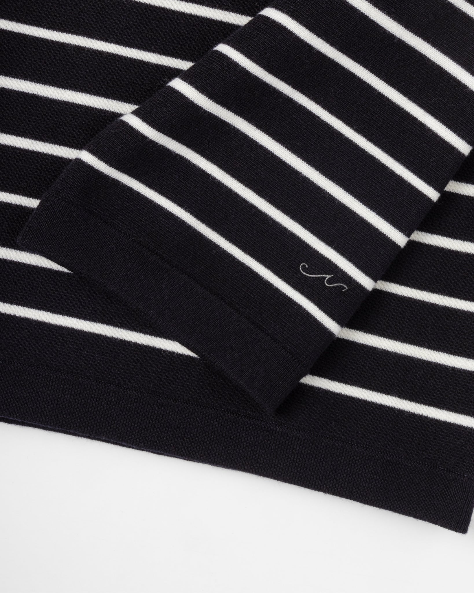 ミラノリブで仕立てたボーダーニット。ボートネックで首元がすっきりし、ゆったりとしたサイズ感が特徴です。短めの袖丈で、同素材のアームウォーマーと合わせたスタイリングもおすすめです。