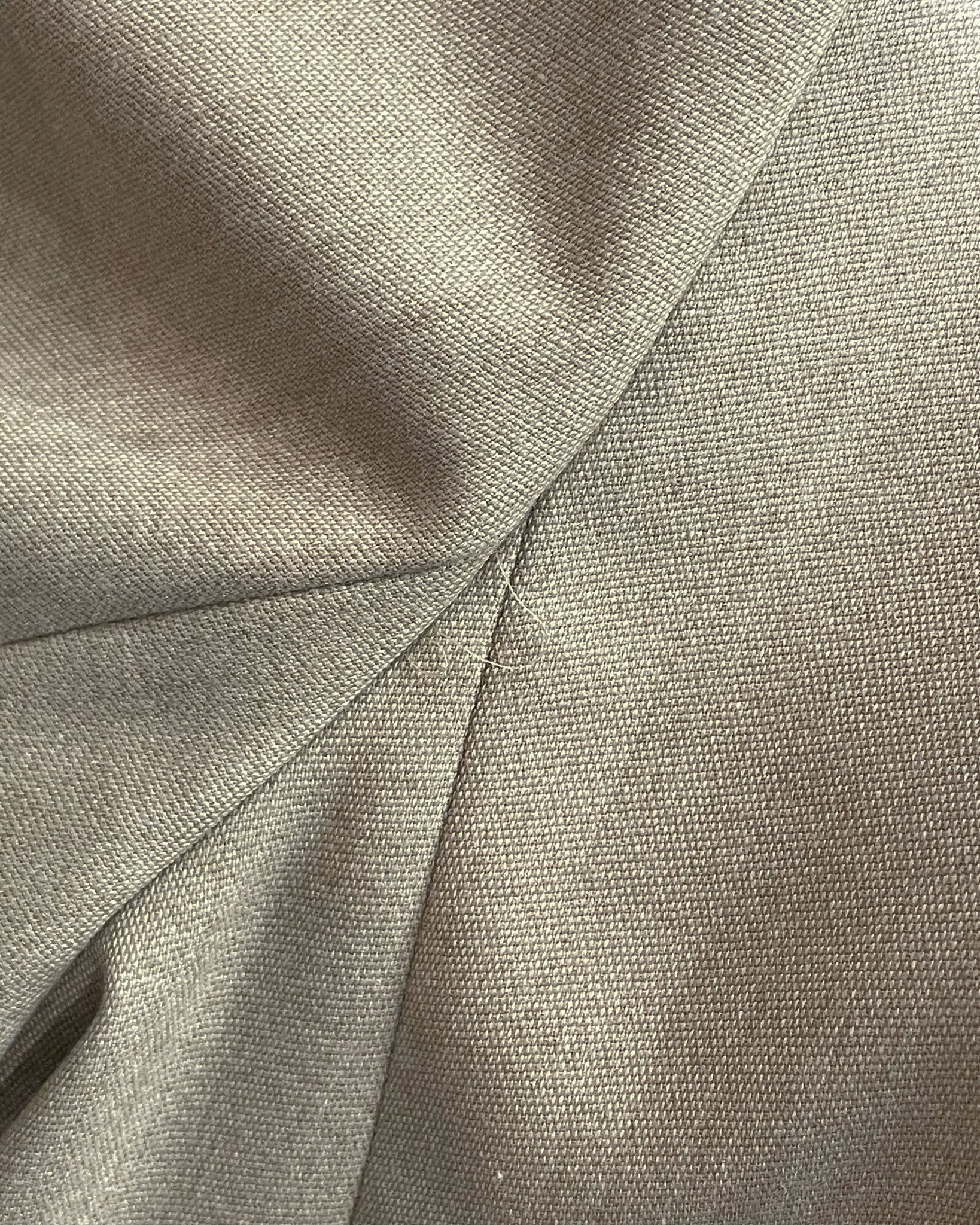ドビー機を使った二重織生地を使用。組織の表情があり、奥行きのある洗練された印象に仕上がる生地です。見た目はフォーマルながらも体に馴染む柔らかさと手触りの良さがあります。フォーマルなシーンにも使用できるメンズライクな生地です。