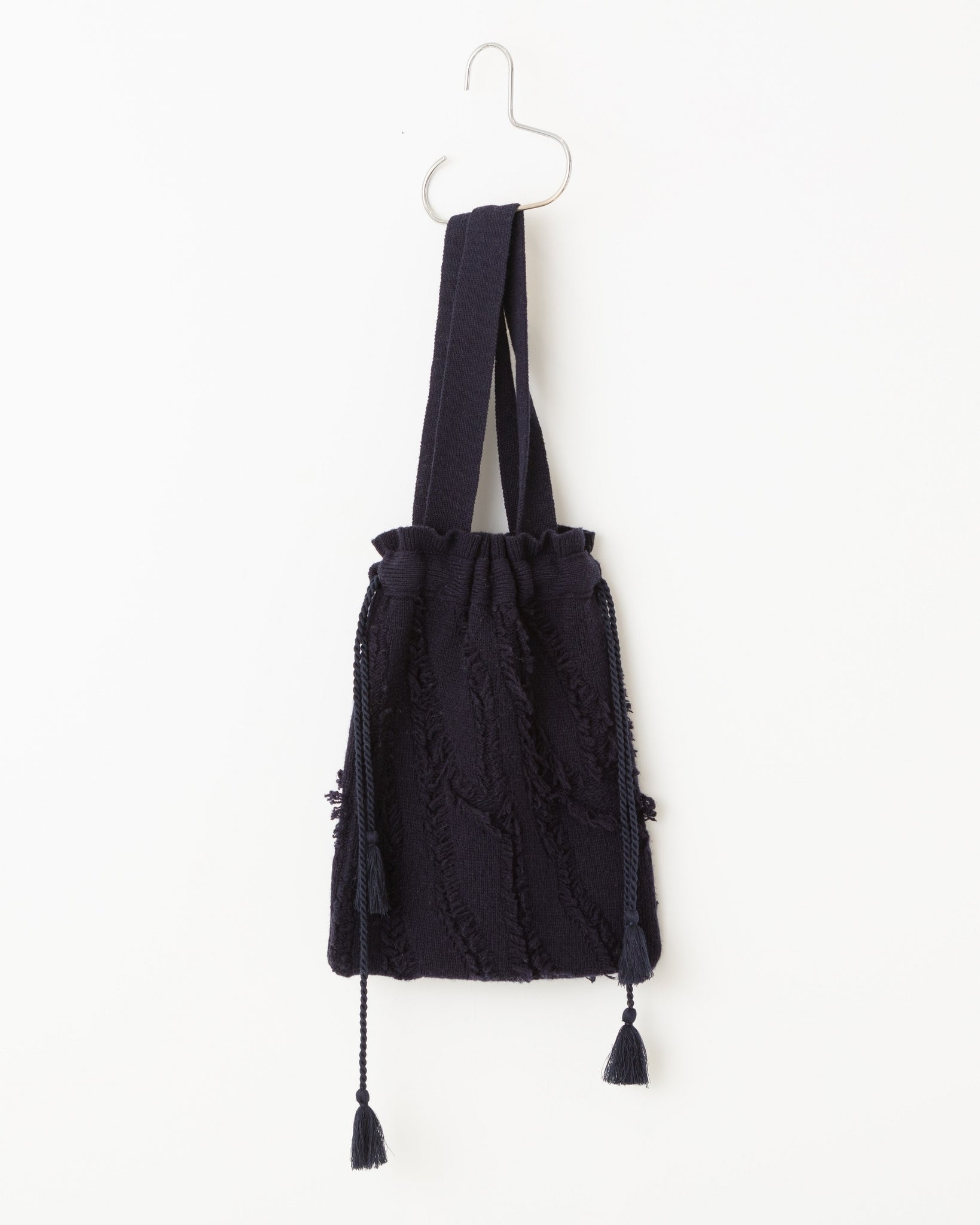 遊び心たっぷりなカットジャカードの巾着ニットバッグ。